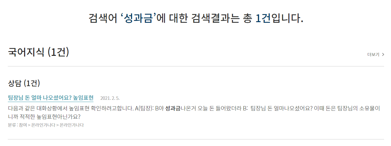 국립국어원 '성과금' 검색 결과입니다. 심지어 질문 내용에만 쓰였습니다.